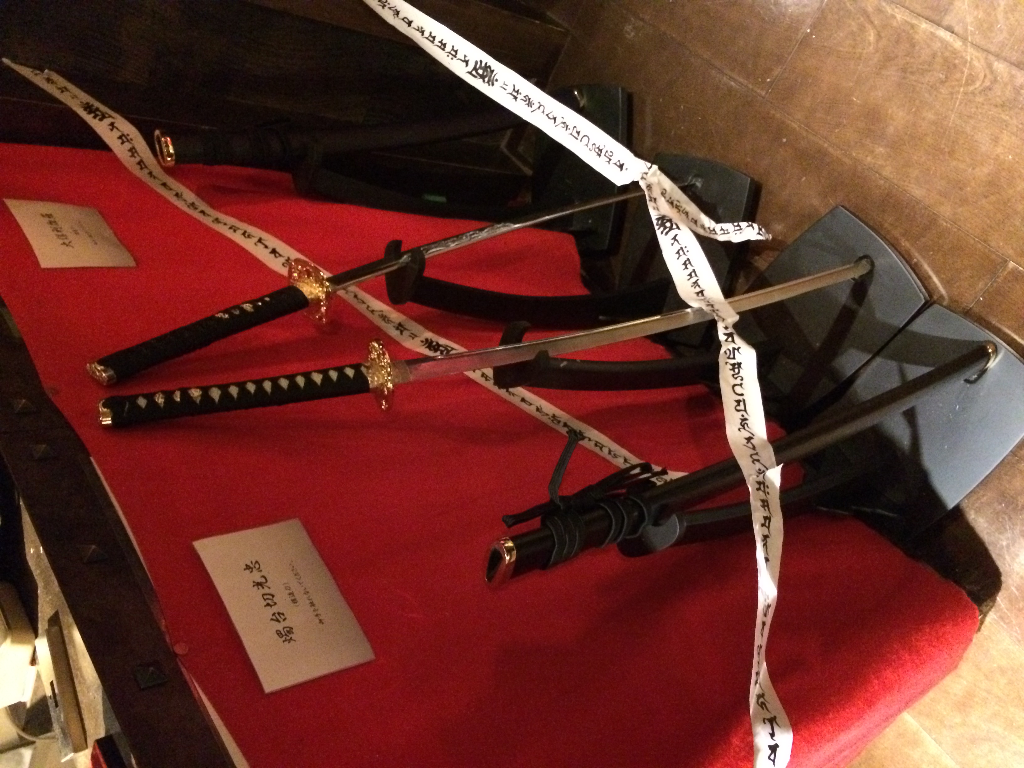 正面に例の山鳥の忠興様の甲冑があって、左右に刀が……。